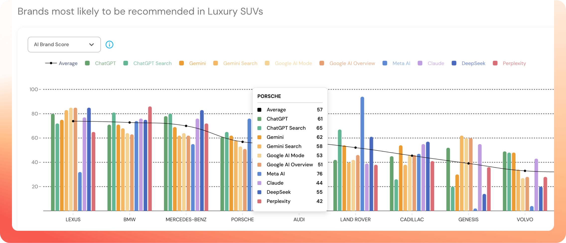 Track your brand and unlock competitor intelligence across every major AI platform with the most comprehensive and statistically significant AI brand analytics available. We show you exactly where you stand, how you're being described and why your competitors might be stealing the spotlight.
