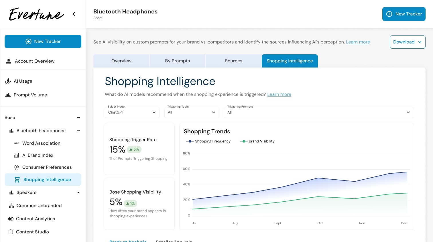 Shopping recommendations in ChatGPT represent a fundamentally different discovery channel than traditional search or even standard AI responses. Evertune Shopping Intelligence helps you:
