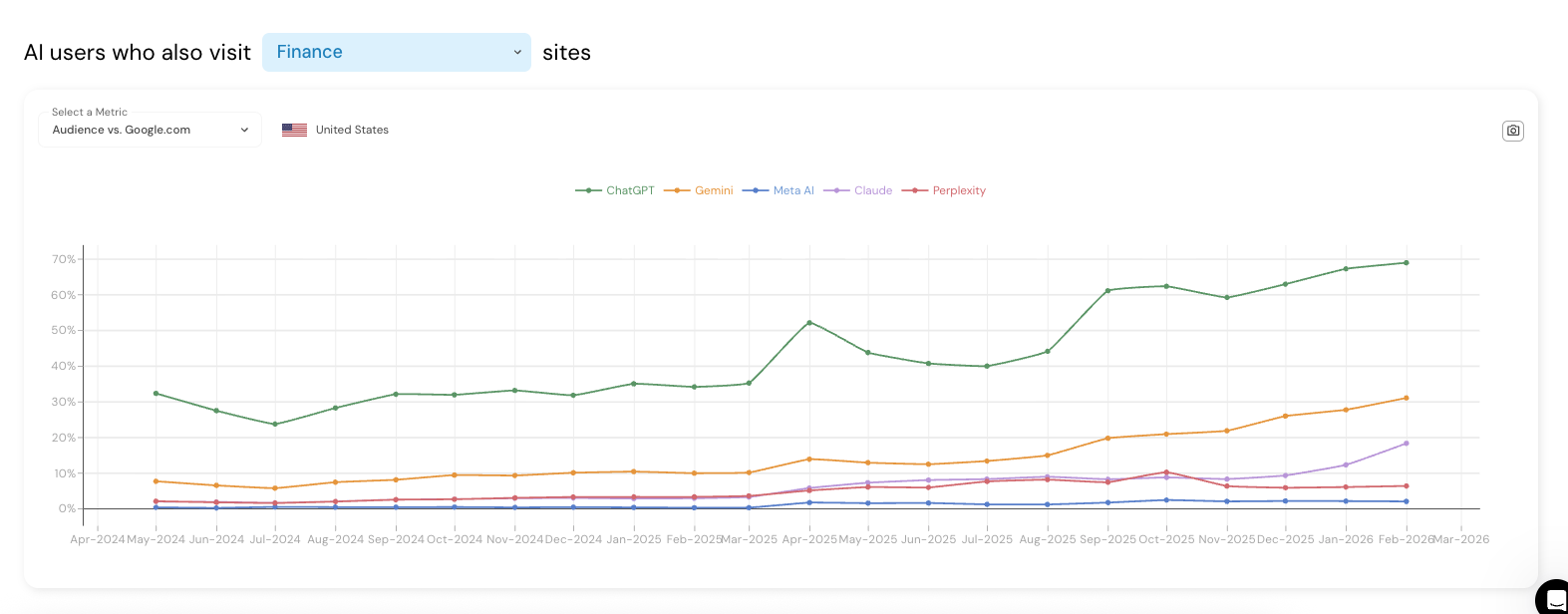 For brands focused exclusively on ChatGPT visibility, Gemini's trajectory is a warning. The second-largest AI audience in the US is now large enough to represent a material blind spot for brands that aren't tracking their position there. Visibility strategies built around a single platform are already incomplete.